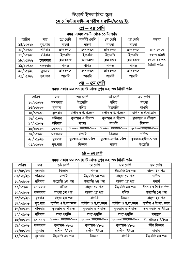 ৬ষ্ঠ - ৯ম শ্রেণি: ০৭ মে - ২১ মে পর্যন্ত।